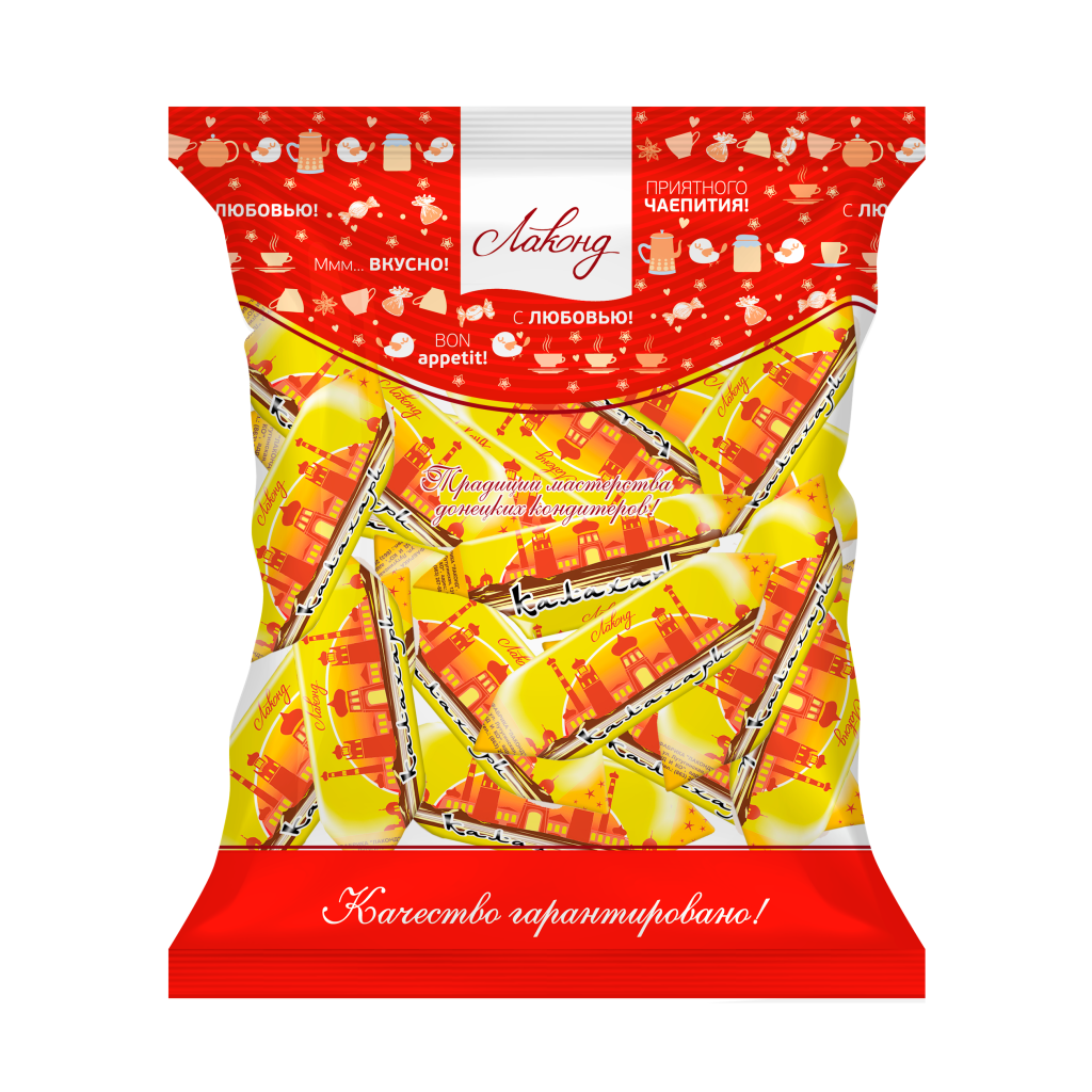 - Этикетка выполнена в традиционном для этих конфет формате: фольгированная завертка для каждой конфетки, и в завершение классическая бумажная «этикетка-носок» с известными мотивами.